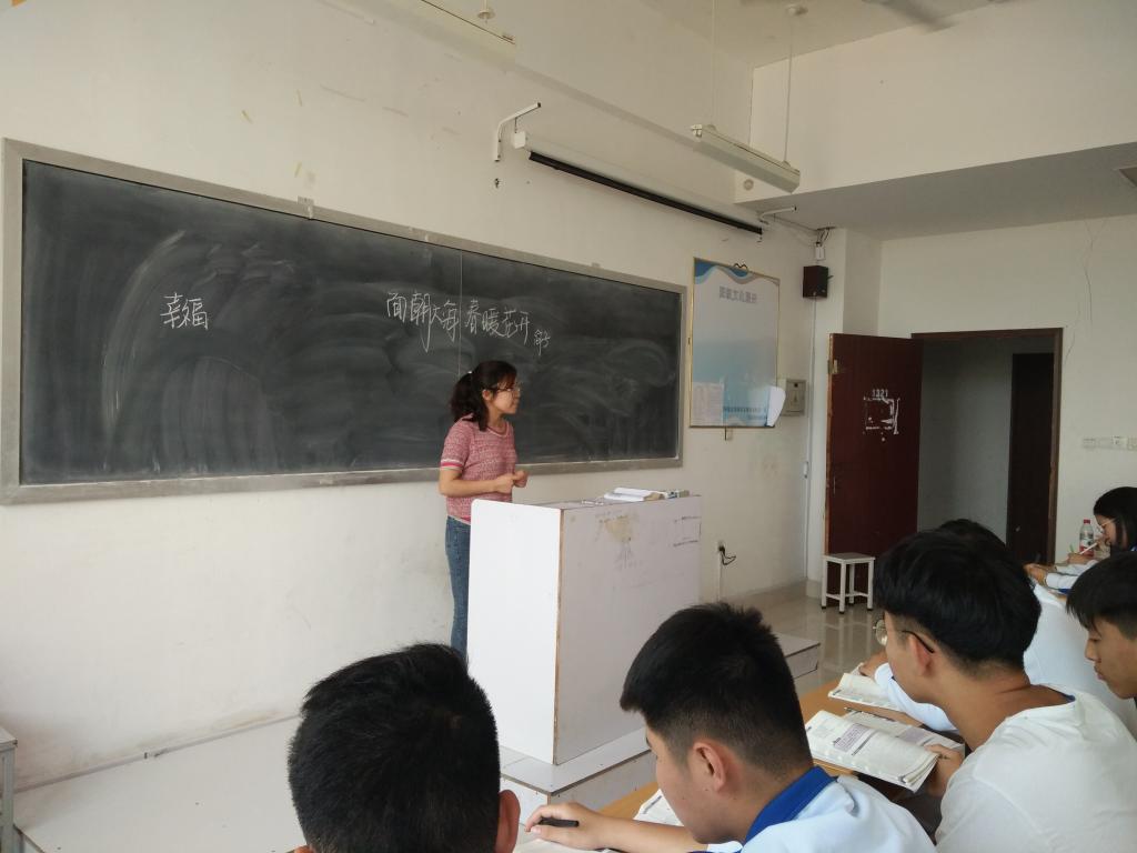 闫佩佩老师以“幸福”这个关键词导入新课,带领大家畅想每个人所认为的幸福图景。紧接着进入正文的讲解,由诗人的幸福进而讲到诗人背后的不幸福,中间以诗人的人生经历为过渡,教学设计非常连贯清晰。理论要联系实际,闫老师在讲授中,源于诗歌,又超出诗歌,对生活中重要事情的经营、幸福快乐的分享、活在当下以及精神家园等一系列和生活息息相关的问题进行详细地介绍。并且在整堂课中,闫老师展示了自己的文学底蕴,将作诗、画画融入课堂,教学模式多样化。