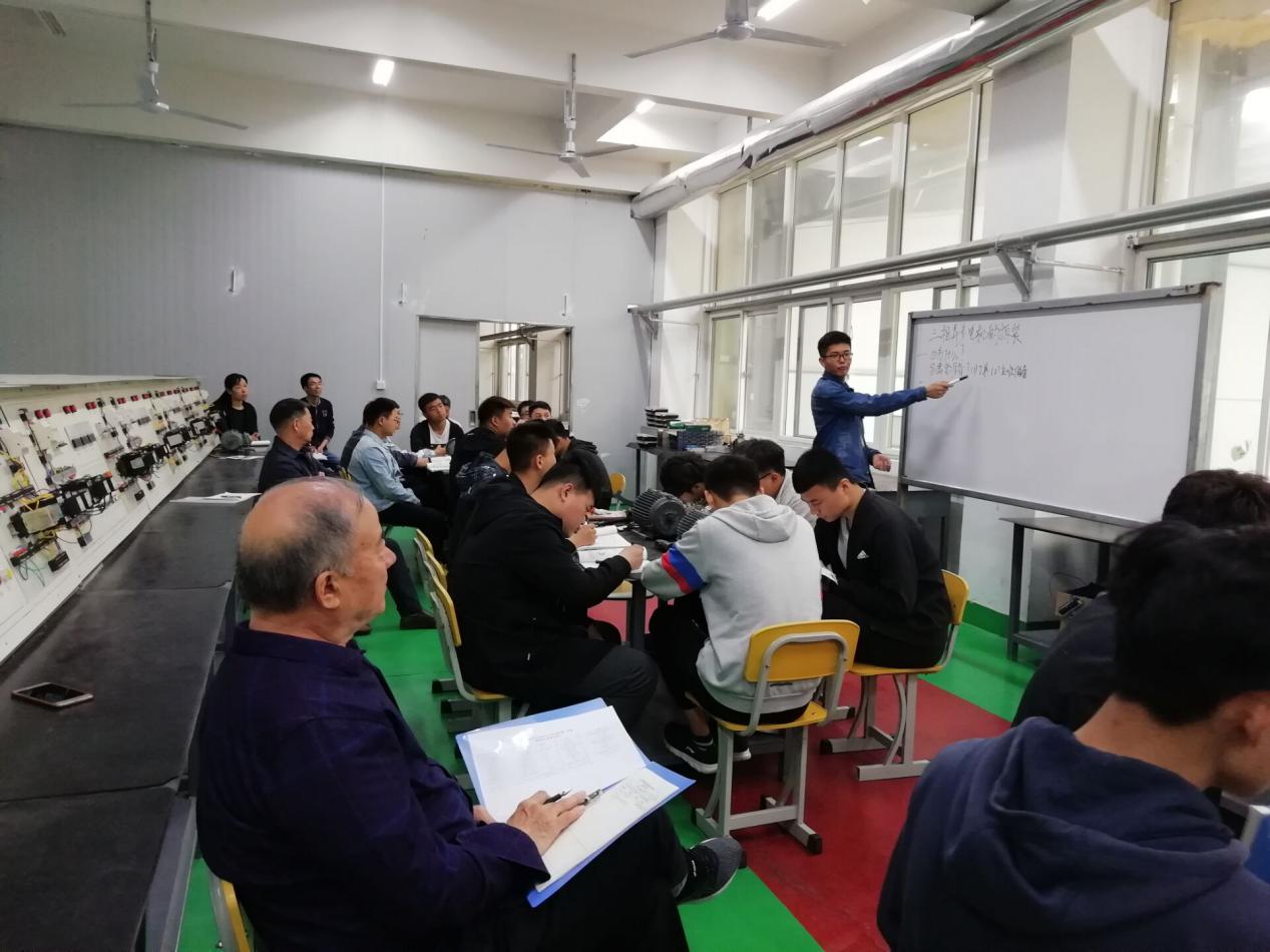 刘老师首先进行原理讲解,后面进行实训,课堂上,刘老师先就上节课三相异步电动机理论知识进行了复习,从三相异步电动机拆卸的基本步骤:切断电源→作有关标记→拆卸带轮→拆卸联轴器→拆卸风扇罩→拆卸风扇→拆卸后端盖螺钉→拆卸前端盖→抽出转子→拆卸轴承进行了演示。